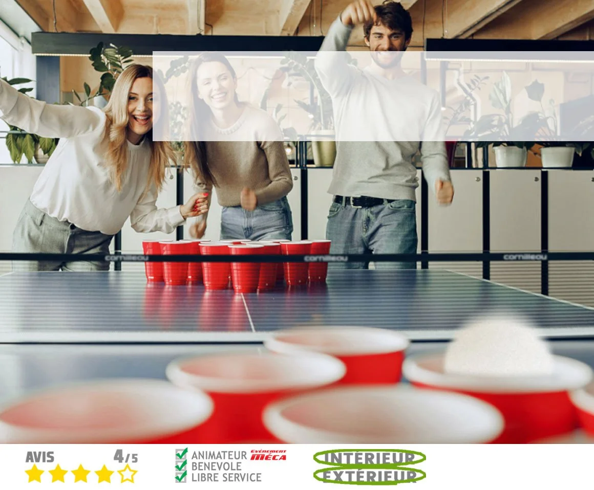 Jeu convivial et festif où deux équipes lancent des balles de ping-pong dans des gobelets disposés en triangle. Idéal pour créer une ambiance décontractée et compétitive. Une animation fun, accessible et rassembleuse, qui attire jeunes, adultes et passionnés d’animations originales.